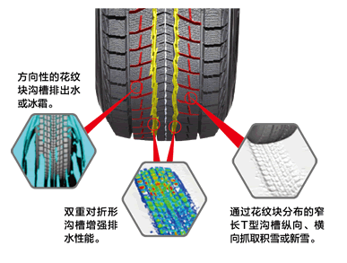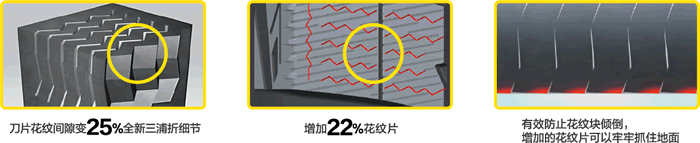 即采用立體式刀片花紋溝槽設(shè)計,使花紋片溝槽間隙變薄25%,同時減少花紋片之間的間隙,目的是抑制花紋塊的傾倒。鋒利的溝槽邊緣能更好地抓住地面,同時也進一步增加了輪胎和冰面的接觸面積,改善座駕直線行駛時的牽引力及彎道行駛時的穩(wěn)定性,讓您在征服嚴冬的路上操控自如。