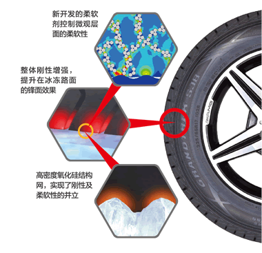 由二氧化硅、高分子化合物、柔軟劑組成,通過特定的分子結(jié)構(gòu)組合,能夠非常有效的發(fā)揮橡膠整體的柔軟性,其中高密度氧化硅的使用實現(xiàn)了剛性及柔軟性的并立,從而擁有比普通輪胎更大的摩擦力與耐磨性,確保其在極低溫度下仍保持柔韌質(zhì)地,為您的行車安全提供最佳保障。