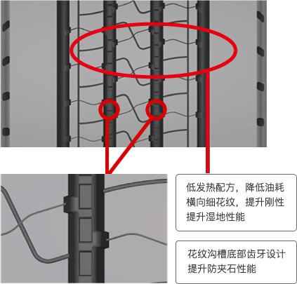 通過花紋溝槽底部齒牙設計,提升防夾石性能;