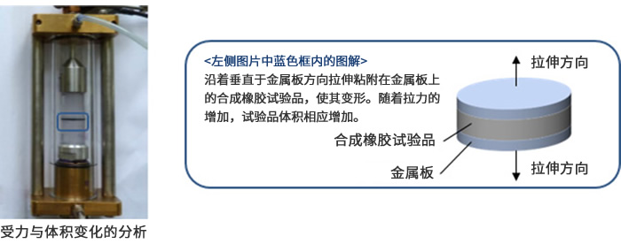 把圓片形合成橡膠試驗品夾在同樣形狀的金屬板中間,并將其固定在金屬板上,通過用垂直于金屬板方向的力來拉伸橡膠試驗品來觀察其發(fā)生形變時的受力與體積變化的關(guān)系。同時,通過橡膠試驗品的CT來觀察橡膠內(nèi)部“孔洞”的形成情況。