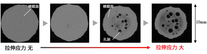 如果合成橡膠試驗品在受到垂直于金屬板方向上的拉伸力時,根據(jù)橡膠自身的特性,橡膠試驗品會向垂直于受力的方向收縮。然而,由于試驗品是被粘貼固定在金屬板上,所以受力時卻又無法自行收縮,結(jié)果致使橡膠膨脹,進(jìn)而可以使我們通過CT直接觀察到橡膠內(nèi)部及其“孔洞”形成的過程。