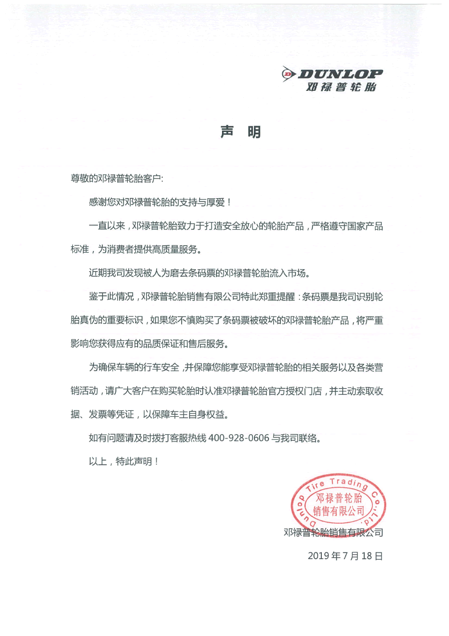 作為擁有百年歷史的全球領(lǐng)先輪胎品牌,鄧祿普秉持對消費(fèi)者積極負(fù)責(zé)的市場宗旨,長期注重維護(hù)客戶自身權(quán)益。針對輪胎市場出現(xiàn)的亂象,鄧祿普輪胎向社會(huì)各界發(fā)出鄭重聲明,提醒廣大消費(fèi)者在購買輪胎時(shí),應(yīng)認(rèn)準(zhǔn)鄧祿普輪胎公司官方授權(quán)的門店進(jìn)行購買,這樣才能充分保障消費(fèi)者自身的合法權(quán)益,不予非法商家牟利空間,與社會(huì)各界共同維護(hù)健康有序的輪胎市場環(huán)境。