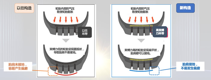 其次,該款產品的胎面橡膠優(yōu)化了橡膠種類和補強材料(炭黑)的使用量,盡可能地抑制了磨損。通過進一步地降低橡膠發(fā)熱性,實現降低滾阻從而減少油耗。另外,胎面內部采用新的結構——高束縛力環(huán)帶,提升胎面剛性,并使胎面更加扁平化,從而實現胎肩牢牢接地,提升耐偏磨性能。