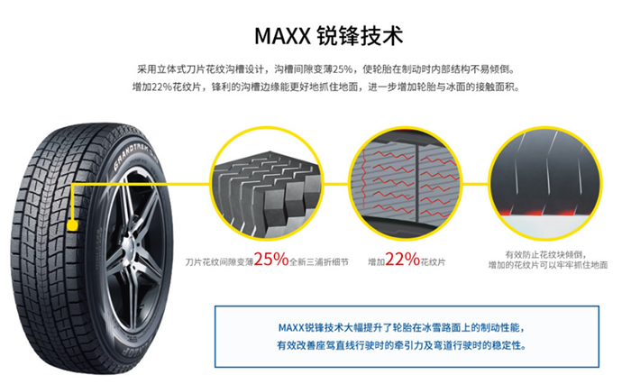 GRANDTREK SJ8冬季胎專為高性能SUV而生,融合 “MAXX銳鋒技術(shù)”,采用立體式刀片花紋溝槽設(shè)計,進一步增加輪胎與冰面的接觸面積,大大提升冰面制動性能。由特定分子結(jié)構(gòu)組合成的4D納米百適橡膠,與冰凍凹凸路面充分貼合,確保在低溫下仍保持柔韌質(zhì)地,提升駕駛的穩(wěn)定性和操控性。SUV專用花紋設(shè)計,可有效排除積水,同時強化了抓雪、壓雪、排雪性能,實現(xiàn)優(yōu)異的雪地性能。該項產(chǎn)品目前有50個規(guī)格,涵蓋16~21寸輪胎,可滿足眾多車輛消費者的需求。