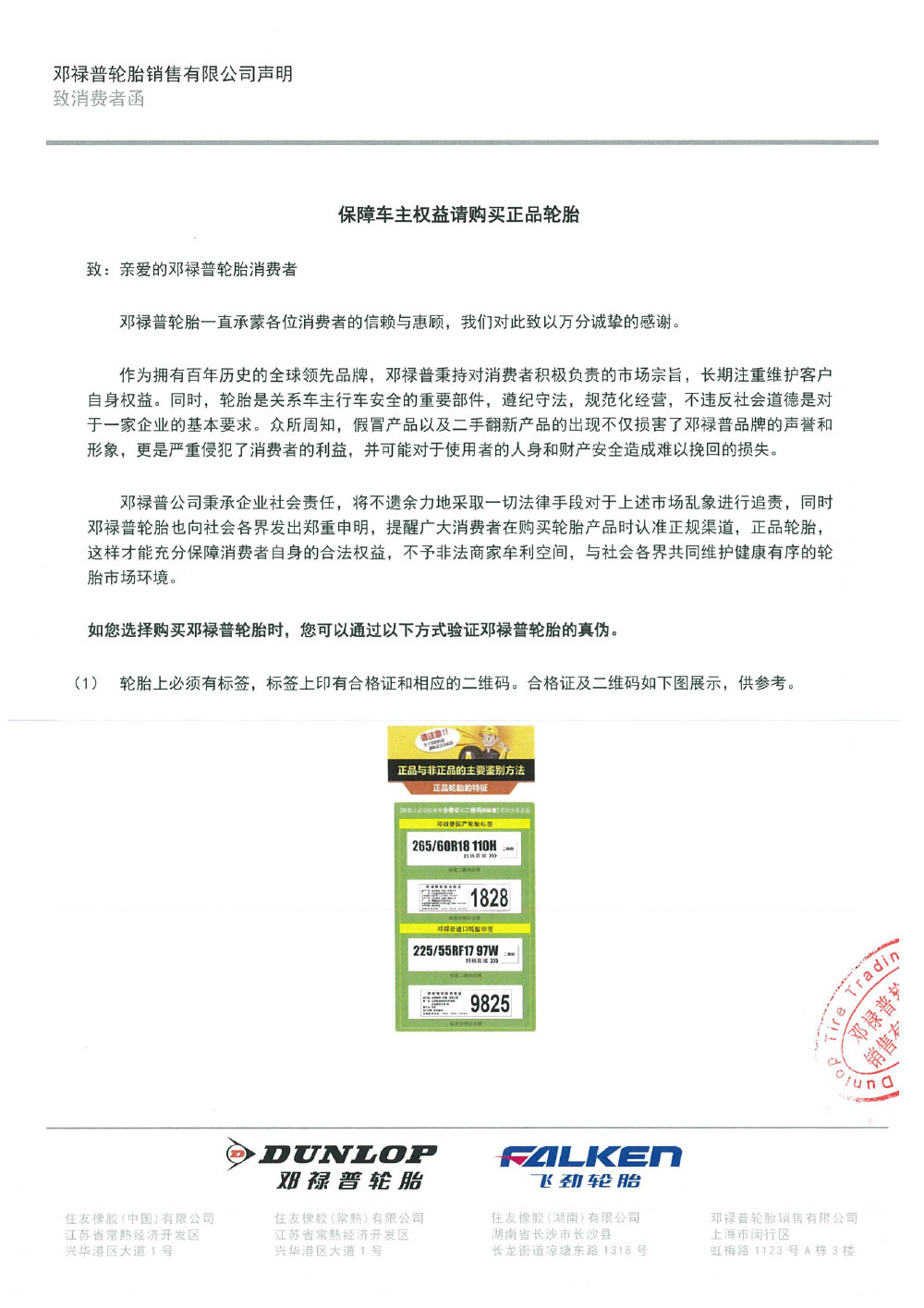作為擁有百年歷史的全球領先品牌,鄧祿普秉持對消費者積極負責的市場宗旨,長期注重維護客戶自身權益。同時,輪胎是關系車主行車安全的重要部件,遵紀守法,規(guī)范化經(jīng)營,不違反社會道德是對于一家企業(yè)的基本要求。眾所周知,假冒產(chǎn)品以及二手翻新產(chǎn)品的出現(xiàn)不僅損害了鄧祿普品牌的聲譽和形象,更是嚴重侵犯了消費者的利益,并可能對于使用者的人身和財產(chǎn)安全造成難以挽回的損失。