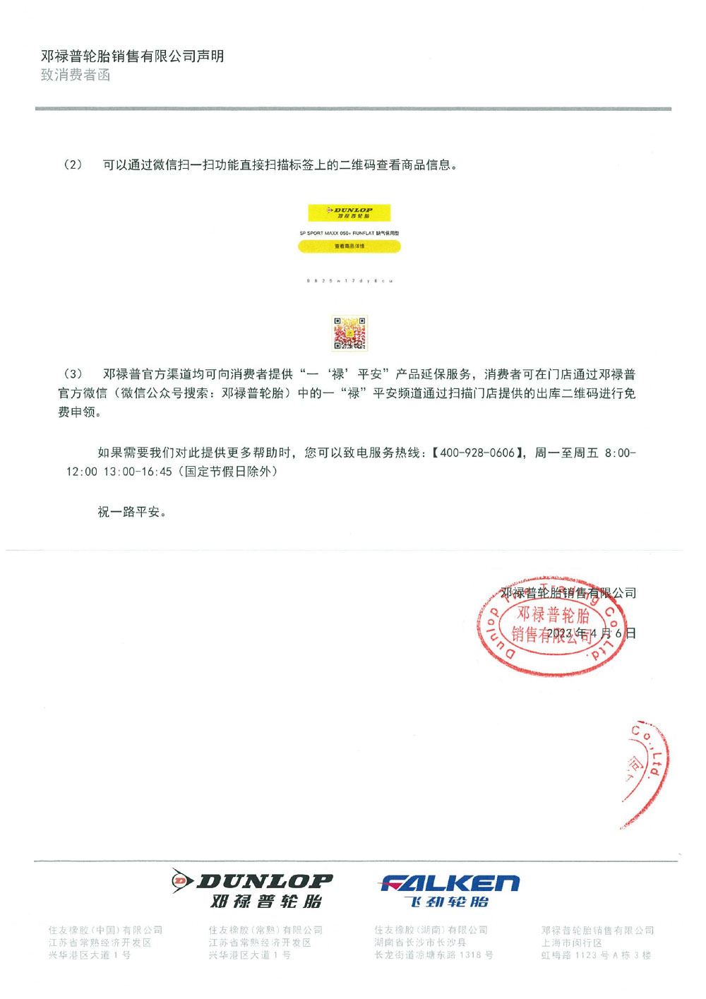 (3)鄧祿普官方渠道均可向消費者提供“一‘祿’平安”產(chǎn)品延保服務,消費者可在門店通過鄧祿普官方微信(微信公眾號搜索:鄧祿普輪胎)中的一“祿”平安頻道通過掃描門店提供的出庫二維碼進行免費申領。