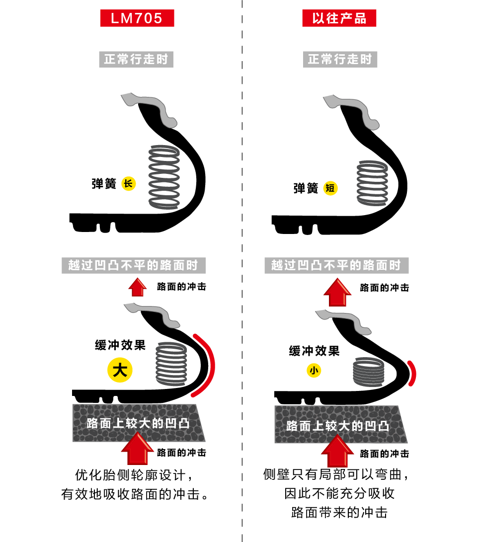采用新技術(shù),對(duì)骨架(截面輪廓+胎面花紋)進(jìn)行優(yōu)化,提升胎側(cè)和胎面的緩沖性能,從而抑制路面沖擊導(dǎo)致的輪胎震動(dòng),提升“駕乘舒適感”和“靜音效果”。