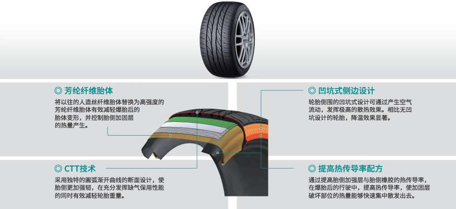 所謂缺氣保用輪胎是指在汽車行駛中出現(xiàn)穿刺,輪胎氣壓降到零時(shí),仍然能夠以設(shè)定的速度行駛一定跑離的輪胎,它因?yàn)橥瑫r(shí)實(shí)現(xiàn)行駛時(shí)安全性能的提高以及取消備用輪胎帶來的資源和燃費(fèi)的節(jié)約這一環(huán)保性能而廣受矚目。目前已被許多車種使用,與汽車的進(jìn)步并肩而行的DUNLOP,從很早開始就著手對(duì)缺氣保用輪胎進(jìn)行研究,并成功實(shí)現(xiàn)實(shí)用化,技術(shù)實(shí)力得到公以。